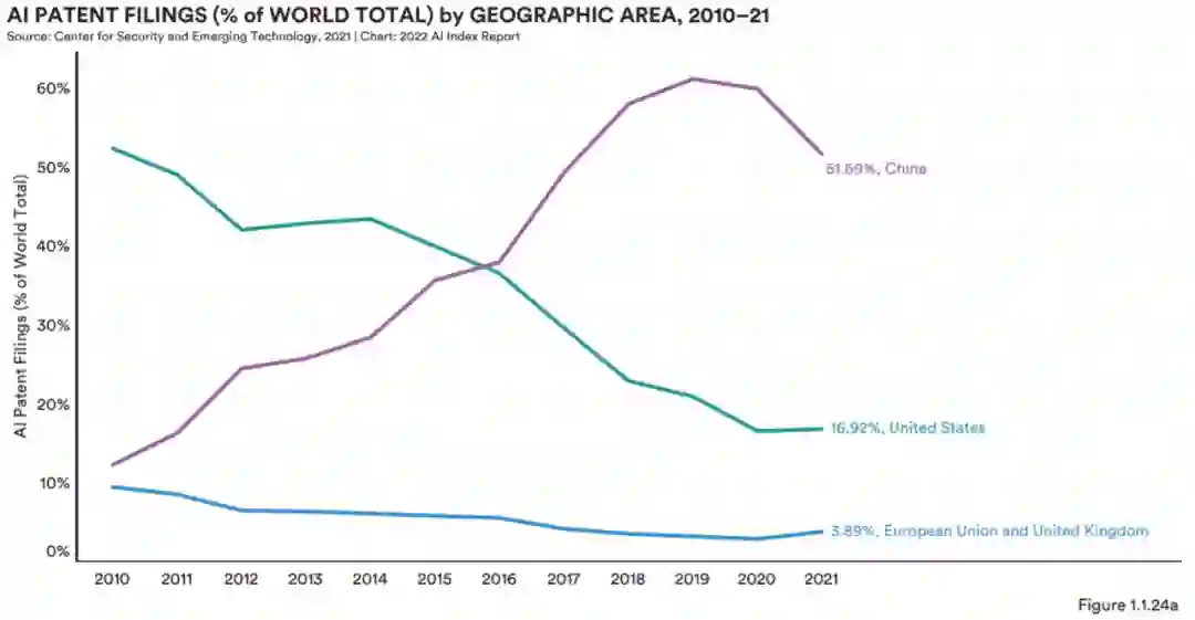 按地理区域:中国现在申请了全球一半以上的人工智能专利,并获得了约 6% 的授权,与欧盟和英国大致相同。美国在北美申请了几乎所有专利。图 1.1.24c 显示,与不断增长的人工智能专利申请和授权数量相比,中国的专利申请数量(2021 年为 87,343 件)远高于授权数量(2021 年为 1,407 件)。