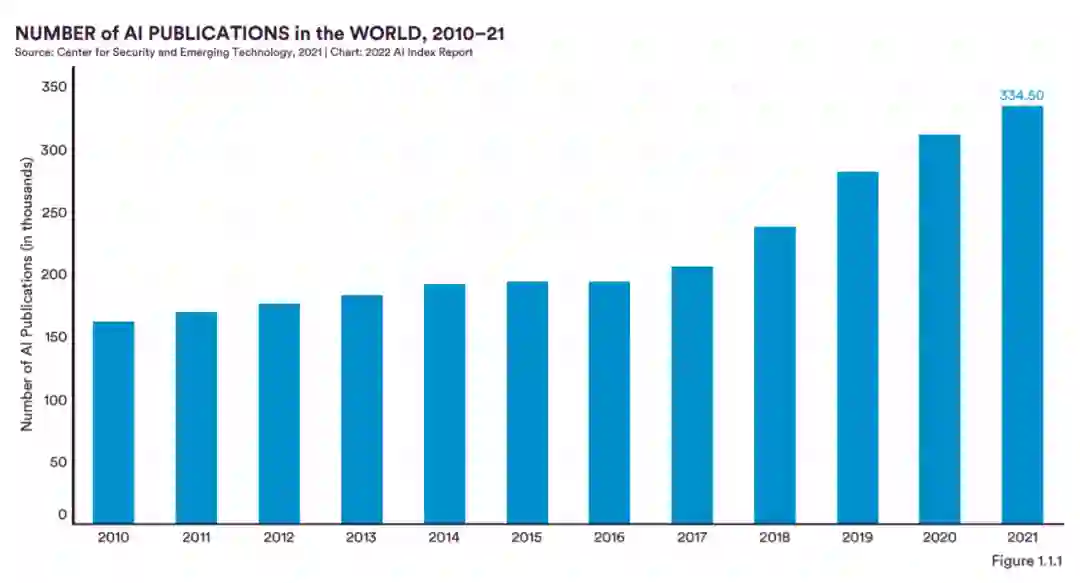 图 1.1.1 为全球 AI 出版物数量。从 2010 年到 2021 年,AI 出版物的总数量翻了一番,从 2010 年的 162444 篇增加到 2021 年的 334497 篇。