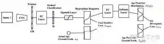 此论文将有序排序转换为一系列二分类问题,每个子问题只判断输入人脸是否比k年龄大,这样作者使用CNN将年龄回归问题转换为一个多输出的分类问题。