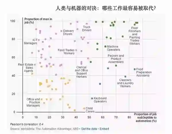人工智能是一种创造性的毁灭,它将淘汰许多岗位,但也将创造新的角色和岗位。根据2017年8月澳大利亚广播公司(ABC)的一项新闻调查显示,最容易被自动化取代的是程序化、重复性的工作岗位。