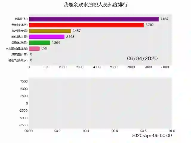# 中文显示plt.rcParams['font.sans-serif'] = ['SimHei'] # Windowsplt.rcParams['font.sans-serif'] = ['Hiragino Sans GB'] # Macplt.rcParams['axes.unicode_minus'] = False# 读取数据df_result = pd.read_csv('data/yuhuanshui.csv', index_col=0, parse_dates=[0])# 生成图表animated_line_chart = df_result.diff().fillna(0).plot_animated(kind='line', period_label=False, add_legend=False)animated_bar_chart = df_result.plot_animated(n_visible=10)pandas_alive.animate_multiple_plots('examples/yuhuanshui.gif',[animated_bar_chart, animated_line_chart], enable_progress_bar=True,title='我是余欢水演职人员热度排行')