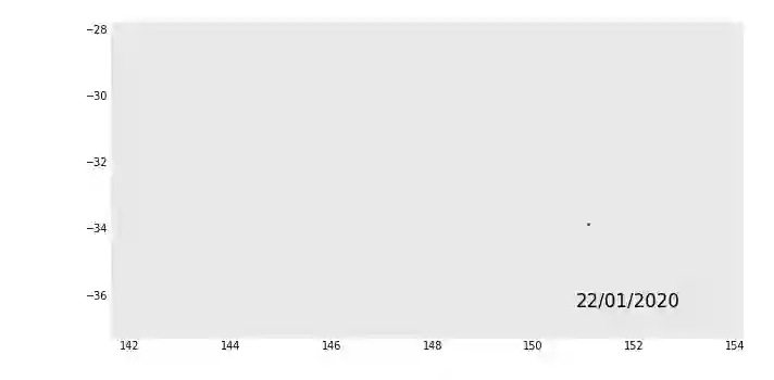 import geopandasimport pandas_aliveimport contextilygdf = geopandas.read_file('data/nsw-covid19-cases-by-postcode.gpkg')gdf.index = gdf.postcodegdf = gdf.drop('postcode',axis=1)result = gdf.iloc[:, :20]result['geometry'] = gdf.iloc[:, -1:]['geometry']map_chart = result.plot_animated(filename='examples/example-geo-point-chart.gif',basemap_format={'source':contextily.providers.Stamen.Terrain})