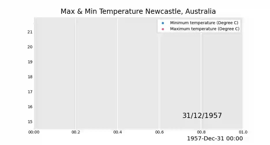 max_temp_df = pd.read_csv("data/Newcastle_Australia_Max_Temps.csv",parse_dates={"Timestamp": ["Year", "Month", "Day"]},)min_temp_df = pd.read_csv("data/Newcastle_Australia_Min_Temps.csv",parse_dates={"Timestamp": ["Year", "Month", "Day"]},)max_temp_df = max_temp_df.iloc[:5000, :]min_temp_df = min_temp_df.iloc[:5000, :]merged_temp_df = pd.merge_asof(max_temp_df, min_temp_df, on="Timestamp")merged_temp_df.index = pd.to_datetime(merged_temp_df["Timestamp"].dt.strftime('%Y/%m/%d'))keep_columns = ["Minimum temperature (Degree C)", "Maximum temperature (Degree C)"]merged_temp_df[keep_columns].resample("Y").mean().plot_animated(filename='examples/example-scatter-chart.gif', kind="scatter",title='Max & Min Temperature Newcastle, Australia')