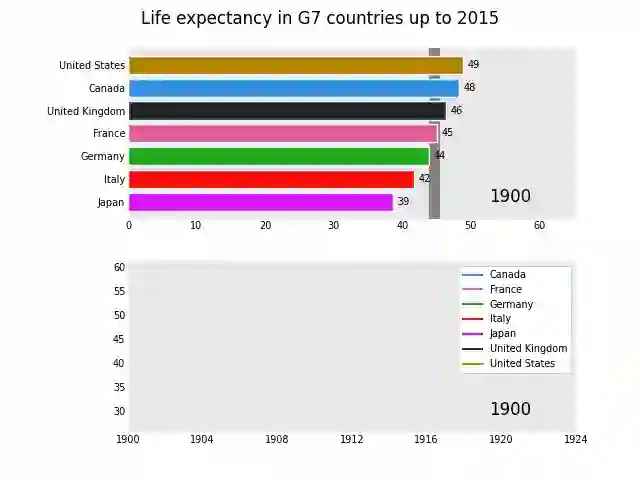 pandas_alive.animate_multiple_plots( "examples/life-expectancy.gif", plots=[animated_bar_chart, animated_line_chart], title="Life expectancy in G7 countries up to 2015", adjust_subplot_left=0.2, adjust_subplot_top=0.9, enable_progress_bar=True )