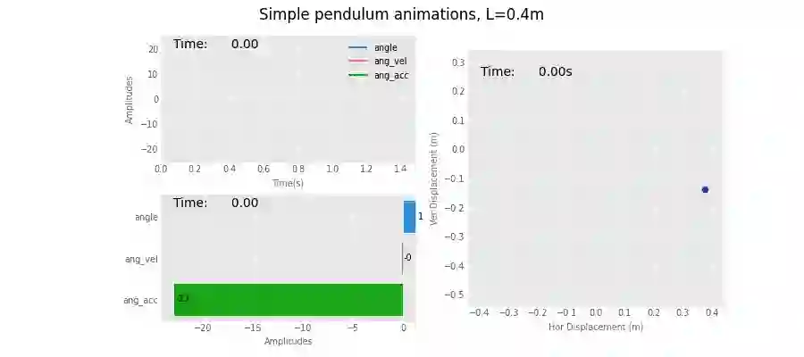 def simple():import pandas as pdimport matplotlib.pyplot as pltimport pandas_aliveimport numpy as np# Physical constantsg = 9.81L = .4mu = 0.2THETA_0 = np.pi * 70 / 180 # init angle = 70degsTHETA_DOT_0 = 0 # no init angVelDELTA_T = 0.01 # time steppingT = 1.5 # time period# Definition of ODE (ordinary differential equation)def get_theta_double_dot(theta, theta_dot):return -mu * theta_dot - (g / L) * np.sin(theta)# Solution to the differential equationdef pendulum(t):# initialise changing valuestheta = THETA_0theta_dot = THETA_DOT_0delta_t = DELTA_Tang = []ang_vel = []ang_acc = []times = []for time in np.arange(0, t, delta_t):theta_double_dot = get_theta_double_dot(theta, theta_dot)theta += theta_dot * delta_ttheta_dot += theta_double_dot * delta_ttimes.append(time)ang.append(theta)ang_vel.append(theta_dot)ang_acc.append(theta_double_dot)data = np.array([ang, ang_vel, ang_acc])return pd.DataFrame(data=data.T, index=np.array(times), columns=["angle", "ang_vel", "ang_acc"])# units used for ref: ["angle [rad]", "ang_vel [rad/s]", "ang_acc [rad/s^2]"]df = pendulum(T)df.index.names = ["Time (s)"]print(df)# generate dataFrame for animated bubble plotdf2 = pd.DataFrame(index=df.index)df2["dx (m)"] = L * np.sin(df["angle"])df2["dy (m)"] = -L * np.cos(df["angle"])df2["ang_vel"] = abs(df["ang_vel"])df2["size"] = df2["ang_vel"] * 100 # scale angular vels to get nice size on bubble plotprint(df2)# static pandas plots## print(plt.style.available)# NOTE: 2 lines below required in Jupyter to switch styles correctlyplt.rcParams.update(plt.rcParamsDefault)plt.style.use("ggplot") # set plot stylefig, (ax1a, ax2b) = plt.subplots(1, 2, figsize=(8, 4), dpi=100) # 1 row, 2 subplots# fig.subplots_adjust(wspace=0.1) # space subplots in rowfig.set_tight_layout(True)fontsize = "small"df.plot(ax=ax1a).legend(fontsize=fontsize)ax1a.set_title("Outputs vs Time", fontsize="medium")ax1a.set_xlabel('Time [s]', fontsize=fontsize)ax1a.set_ylabel('Amplitudes', fontsize=fontsize);df.plot(ax=ax2b, x="angle", y=["ang_vel", "ang_acc"]).legend(fontsize=fontsize)ax2b.set_title("Outputs vs Angle | Phase-Space", fontsize="medium")ax2b.set_xlabel('Angle [rad]', fontsize=fontsize)ax2b.set_ylabel('Angular Velocity / Acc', fontsize=fontsize)# sample scatter plot with colorbarfig, ax = plt.subplots()sc = ax.scatter(df2["dx (m)"], df2["dy (m)"], s=df2["size"] * .1, c=df2["ang_vel"], cmap="jet")cbar = fig.colorbar(sc)cbar.set_label(label="ang_vel [rad/s]", fontsize="small")# sc.set_clim(350, 400)ax.tick_params(labelrotation=0, labelsize="medium")ax_scale = 1.ax.set_xlim(-L * ax_scale, L * ax_scale)ax.set_ylim(-L * ax_scale - 0.1, L * ax_scale - 0.1)# make axes square: a circle shows as a circleax.set_aspect(1 / ax.get_data_ratio())ax.arrow(0, 0, df2["dx (m)"].iloc[-1], df2["dy (m)"].iloc[-1],color="dimgray", ls=":", lw=2.5, width=.0, head_width=0, zorder=-1)ax.text(0, 0.15, s="size and colour of pendulum bob\nbased on pd column\nfor angular velocity",ha='center', va='center')# plt.show()dpi = 100ax_scale = 1.1figsize = (3, 3)fontsize = "small"# set up figure to pass onto `pandas_alive`# NOTE: by using Figure (capital F) instead of figure() `FuncAnimation` seems to run twice as fast!# fig1, ax1 = plt.subplots()fig1 = plt.Figure()ax1 = fig1.add_subplot()fig1.set_size_inches(figsize)ax1.set_title("Simple pendulum animation, L=" + str(L) + "m", fontsize="medium")ax1.set_xlabel("Time (s)", color='dimgray', fontsize=fontsize)ax1.set_ylabel("Amplitudes", color='dimgray', fontsize=fontsize)ax1.tick_params(labelsize=fontsize)# pandas_aliveline_chart = df.plot_animated(filename="pend-line.gif", kind='line', period_label={'x': 0.05, 'y': 0.9},steps_per_period=1, interpolate_period=False, period_length=50,period_fmt='Time:{x:10.2f}',enable_progress_bar=True, fixed_max=True, dpi=100, fig=fig1)plt.close()# Video('examples/pend-line.mp4', html_attributes="controls muted autoplay")# set up and generate animated scatter plot## set up figure to pass onto `pandas_alive`# NOTE: by using Figure (capital F) instead of figure() `FuncAnimation` seems to run twice as fast!fig1sc = plt.Figure()ax1sc = fig1sc.add_subplot()fig1sc.set_size_inches(figsize)ax1sc.set_title("Simple pendulum animation, L=" + str(L) + "m", fontsize="medium")ax1sc.set_xlabel("Time (s)", color='dimgray', fontsize=fontsize)ax1sc.set_ylabel("Amplitudes", color='dimgray', fontsize=fontsize)ax1sc.tick_params(labelsize=fontsize)# pandas_alivescatter_chart = df.plot_animated(filename="pend-scatter.gif", kind='scatter', period_label={'x': 0.05, 'y': 0.9},steps_per_period=1, interpolate_period=False, period_length=50,period_fmt='Time:{x:10.2f}',enable_progress_bar=True, fixed_max=True, dpi=100, fig=fig1sc, size="ang_vel")plt.close()print("Points size follows one of the pd columns: ang_vel")# Video('./pend-scatter.gif', html_attributes="controls muted autoplay")# set up and generate animated bar race chart## set up figure to pass onto `pandas_alive`# NOTE: by using Figure (capital F) instead of figure() `FuncAnimation` seems to run twice as fast!fig2 = plt.Figure()ax2 = fig2.add_subplot()fig2.set_size_inches(figsize)ax2.set_title("Simple pendulum animation, L=" + str(L) + "m", fontsize="medium")ax2.set_xlabel("Amplitudes", color='dimgray', fontsize=fontsize)ax2.set_ylabel("", color='dimgray', fontsize="x-small")ax2.tick_params(labelsize=fontsize)# pandas_aliverace_chart = df.plot_animated(filename="pend-race.gif", kind='race', period_label={'x': 0.05, 'y': 0.9},steps_per_period=1, interpolate_period=False, period_length=50,period_fmt='Time:{x:10.2f}',enable_progress_bar=True, fixed_max=False, dpi=100, fig=fig2)plt.close()# set up and generate bubble animated plot## set up figure to pass onto `pandas_alive`# NOTE: by using Figure (capital F) instead of figure() `FuncAnimation` seems to run twice as fast!fig3 = plt.Figure()ax3 = fig3.add_subplot()fig3.set_size_inches(figsize)ax3.set_title("Simple pendulum animation, L=" + str(L) + "m", fontsize="medium")ax3.set_xlabel("Hor Displacement (m)", color='dim