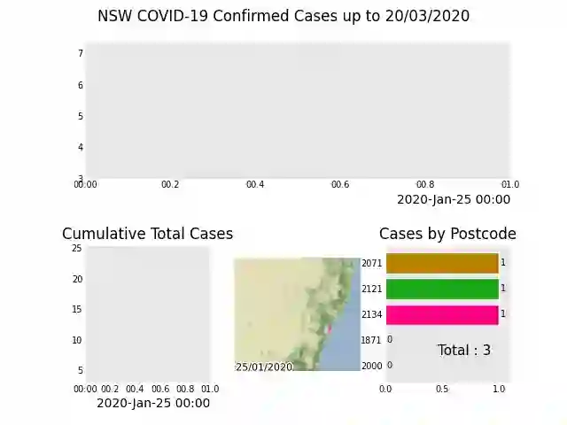 def nsw():import geopandasimport pandas as pdimport pandas_aliveimport contextilyimport matplotlib.pyplot as pltimport jsonwith open('data/package_show.json', 'r', encoding='utf8')as fp:data = json.load(fp)# Extract url to csv componentcovid_nsw_data_url = data["result"]["resources"][0]["url"]print(covid_nsw_data_url)# Read csv from data API urlnsw_covid = pd.read_csv('data/confirmed_cases_table1_location.csv')postcode_dataset = pd.read_csv("data/postcode-data.csv")# Prepare data from NSW health datasetnsw_covid = nsw_covid.fillna(9999)nsw_covid["postcode"] = nsw_covid["postcode"].astype(int)grouped_df = nsw_covid.groupby(["notification_date", "postcode"]).size()grouped_df = pd.DataFrame(grouped_df).unstack()grouped_df.columns = grouped_df.columns.droplevel().astype(str)grouped_df = grouped_df.fillna(0)grouped_df.index = pd.to_datetime(grouped_df.index)cases_df = grouped_df# Clean data in postcode dataset prior to matchinggrouped_df = grouped_df.Tpostcode_dataset = postcode_dataset[postcode_dataset['Longitude'].notna()]postcode_dataset = postcode_dataset[postcode_dataset['Longitude'] != 0]postcode_dataset = postcode_dataset[postcode_dataset['Latitude'].notna()]postcode_dataset = postcode_dataset[postcode_dataset['Latitude'] != 0]postcode_dataset['Postcode'] = postcode_dataset['Postcode'].astype(str)# Build GeoDataFrame from Lat Long dataset and make map chartgrouped_df['Longitude'] = grouped_df.index.map(postcode_dataset.set_index('Postcode')['Longitude'].to_dict())grouped_df['Latitude'] = grouped_df.index.map(postcode_dataset.set_index('Postcode')['Latitude'].to_dict())gdf = geopandas.GeoDataFrame(grouped_df, geometry=geopandas.points_from_xy(grouped_df.Longitude, grouped_df.Latitude), crs="EPSG:4326")gdf = gdf.dropna()# Prepare GeoDataFrame for writing to geopackagegdf = gdf.drop(['Longitude', 'Latitude'], axis=1)gdf.columns = gdf.columns.astype(str)gdf['postcode'] = gdf.index# gdf.to_file("data/nsw-covid19-cases-by-postcode.gpkg", layer='nsw-postcode-covid', driver="GPKG")# Prepare GeoDataFrame for plottinggdf.index = gdf.postcodegdf = gdf.drop('postcode', axis=1)gdf = gdf.to_crs("EPSG:3857") # Web Mercatorresult = gdf.iloc[:, :22]result['geometry'] = gdf.iloc[:, -1:]['geometry']gdf = resultmap_chart = gdf.plot_animated(basemap_format={'source': contextily.providers.Stamen.Terrain}, cmap='cool')# cases_df.to_csv('data/nsw-covid-cases-by-postcode.csv')cases_df = cases_df.iloc[:22, :]from datetime import datetimebar_chart = cases_df.sum(axis=1).plot_animated(kind='line',label_events={'Ruby Princess Disembark': datetime.strptime("19/03/2020", "%d/%m/%Y"),# 'Lockdown': datetime.strptime("31/03/2020", "%d/%m/%Y")},fill_under_line_color="blue",add_legend=False)map_chart.ax.set_title('Cases by Location')grouped_df = pd.read_csv('data/nsw-covid-cases-by-postcode.csv', index_col=0, parse_dates=[0])grouped_df = grouped_df.iloc[:22, :]line_chart = (grouped_df.sum(axis=1).cumsum().fillna(0).plot_animated(kind="line", period_label=False, title="Cumulative Total Cases", add_legend=False))def current_total(values):total = values.sum()s = f'Total : {int(total)}'return {'x': .85, 'y': .2, 's': s, 'ha': 'right', 'size': 11}race_chart = grouped_df.cumsum().plot_animated(n_visible=5, title="Cases by Postcode", period_label=False, period_summary_func=current_total)import timetimestr = time.strftime("%d/%m/%Y")plots = [bar_chart, line_chart, map_chart, race_chart]from matplotlib import rcParamsrcParams.update({"figure.autolayout": False})# make sure figures are `Figure()` instancesfigs = plt.Figure()gs = figs.add_gridspec(2, 3, hspace=0.5)f3_ax1 = figs.add_subplot(gs[0, :])f3_ax1.set_title(bar_chart.title)bar_chart.ax = f3_ax1f3_ax2 = figs.add_subplot(gs[1, 0])f3_ax2.set_title(line_chart.title)line_chart.ax = f3_ax2f3_ax3 = figs.add_subplot(gs[1, 1])f3_ax3.set_title(map_chart.title)map_chart.ax = f3_ax3f3_ax4 = figs.add_subplot(gs[1, 2])f3_ax4.set_title(race_chart.title)race_chart.ax = f3_ax4timestr = cases_df.index.max().strftime("%d/%m/%Y")figs.suptitle(f"NSW COVID-19 Confirmed Cases up to {timestr}")pandas_alive.animate_multiple_plots('examples/nsw-covid.gif',plots,figs,enable_progress_bar=True)