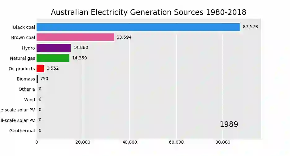 elec_df = pd.read_csv("data/Aus_Elec_Gen_1980_2018.csv", index_col=0, parse_dates=[0], thousands=',')elec_df = elec_df.iloc[:20, :]elec_df.fillna(0).plot_animated('examples/example-electricity-generated-australia.gif', period_fmt="%Y",title='Australian Electricity Generation Sources 1980-2018')