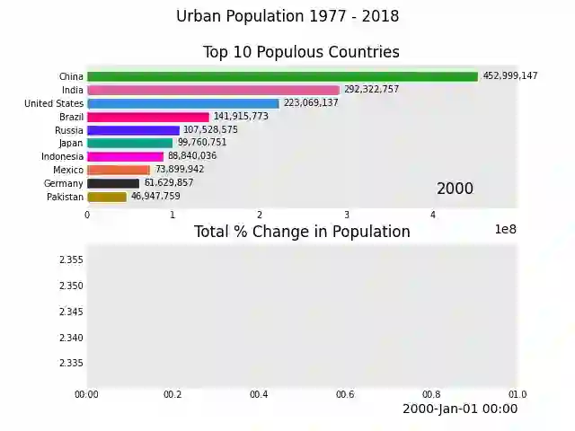 def population():urban_df = pd.read_csv("data/urban_pop.csv", index_col=0, parse_dates=[0])animated_line_chart = (urban_df.sum(axis=1).pct_change().fillna(method='bfill').mul(100).plot_animated(kind="line", title="Total % Change in Population", period_label=False, add_legend=False))animated_bar_chart = urban_df.plot_animated(n_visible=10, title='Top 10 Populous Countries', period_fmt="%Y")pandas_alive.animate_multiple_plots('examples/example-bar-and-line-urban-chart.gif',[animated_bar_chart, animated_line_chart],title='Urban Population 1977 - 2018', adjust_subplot_top=0.85,enable_progress_bar=True)
