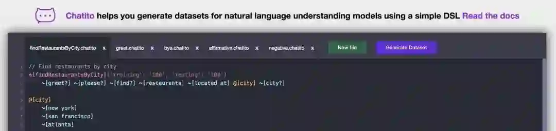 Chatito可帮助你生成用于训练的数据集,并使用简约的DSL验证聊天机器人模型。