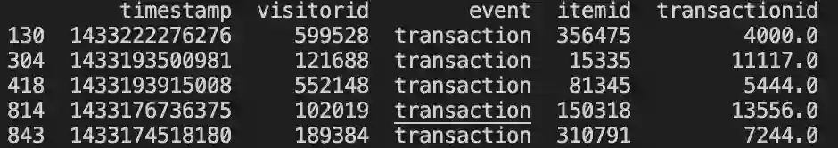 trans = df[df['event'] == 'transaction']trans.shapeprint(trans.head())