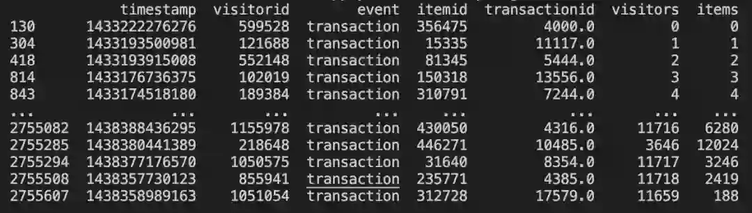 trans2['visitors'] = trans2['visitorid'].apply(lambda x : np.argwhere(visitors == x)[0][0])trans2['items'] = trans2['itemid'].apply(lambda x : np.argwhere(items == x)[0][0])print(trans2)