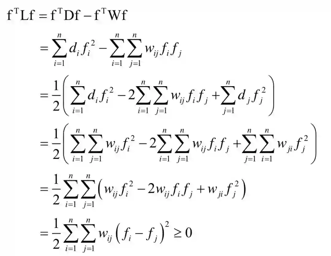 假设L是图的拉普拉斯矩阵,D是加权度对角矩阵,W是邻接矩阵。对于任意不为0的向量f,有: