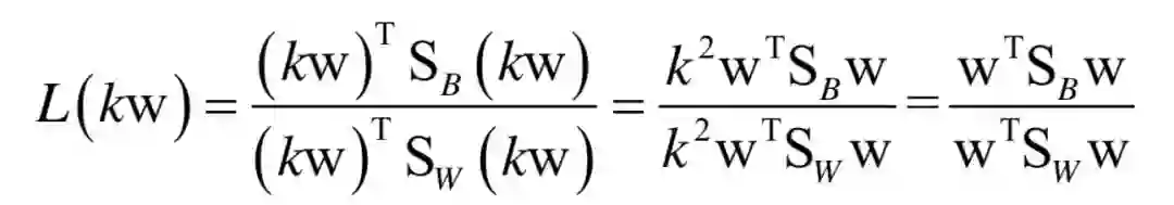 从几何上看,w可kw这两个向量表示的是一个方向,如果w是最佳投影方向,则kw还是这个方向:
