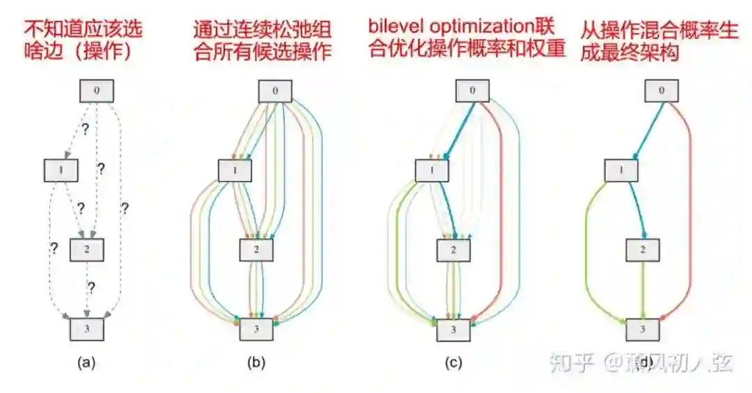 DARTS最大的贡献在于使用了Softmax对本来离散的搜索空间进行了连续化,并用类似于元学习中MAMAL的梯度近似,使得只在一个超网络上就可以完成整个模型的搜索,无需反复训练多个模型。(当然,之后基于演化算法和强化学习的NAS方法也迅速地借鉴了超网络这一特性)。