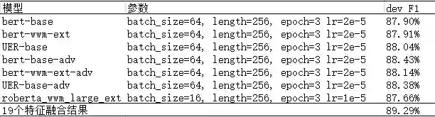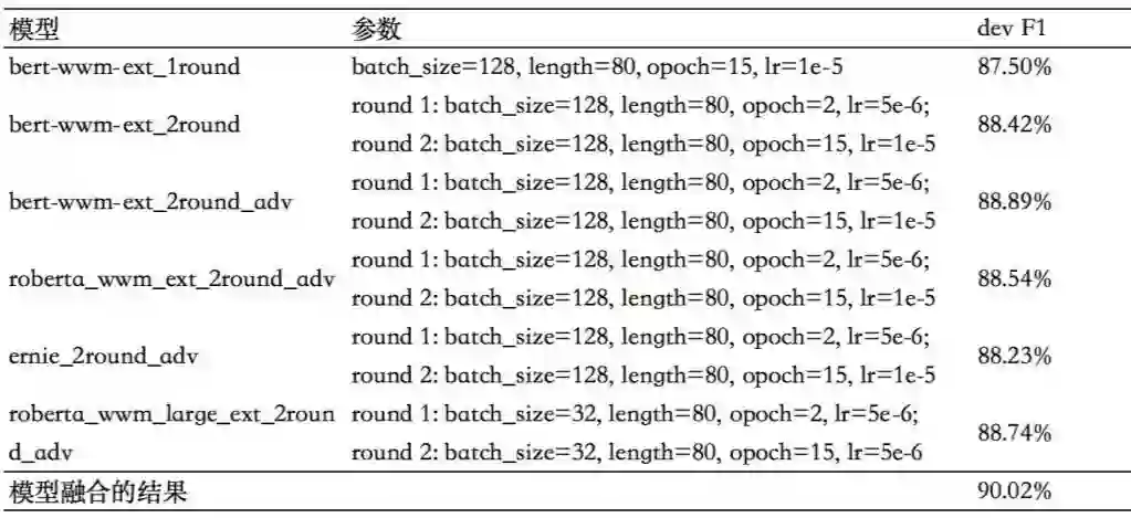 指称项分类模型训练中使用二次训练的方法 F1 提升了约 1%,使用对抗学习 F1 提升了约 0.5%,模型融合后在 Dev 数据上 F1 值达到了 90.02%。具体参数和验证数据集下结果如下表: