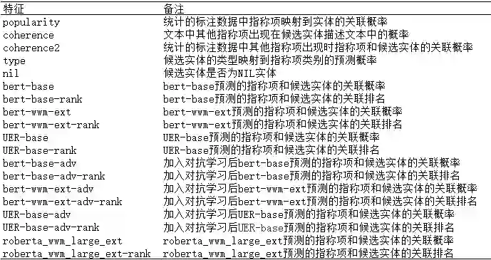 另外我们在实体消歧模块也尝试加入对抗学习来提高模型的鲁棒性,其中对抗学习的方法是 FGM。不同的 BERT 预训练模型抽取的特征不同,为了丰富特征,本模块采用了 19 个特征因子来从不同方面刻画指称项和候选实体的相关性。这 19 个特征如下表 1 所示,分别为: