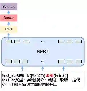 指称项分类是主要基于 BERT 模型,输入数据文本,指称项的起始位置。输入文本,经过 BERT 模型编码,取 CLS 位置的特征向量、指称项开始和结束位置对应的特征向量,三个向量拼接,经过全连接层,最后 Softmax 激活得到指称项的类别概率分布。模型结构如图 1: