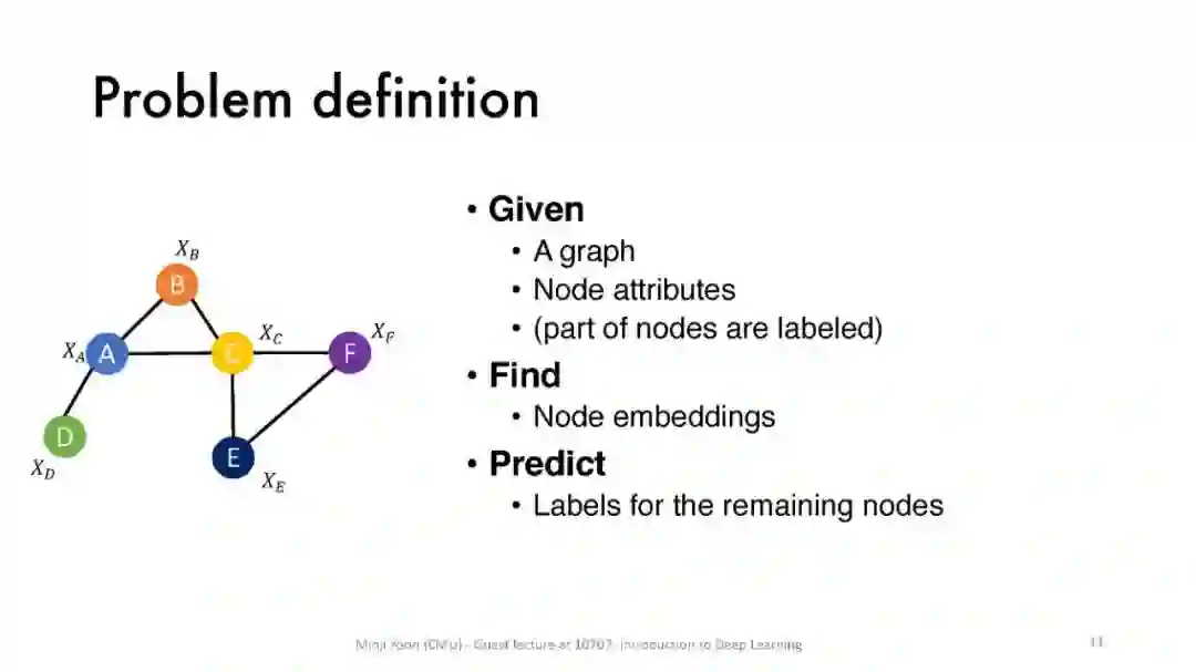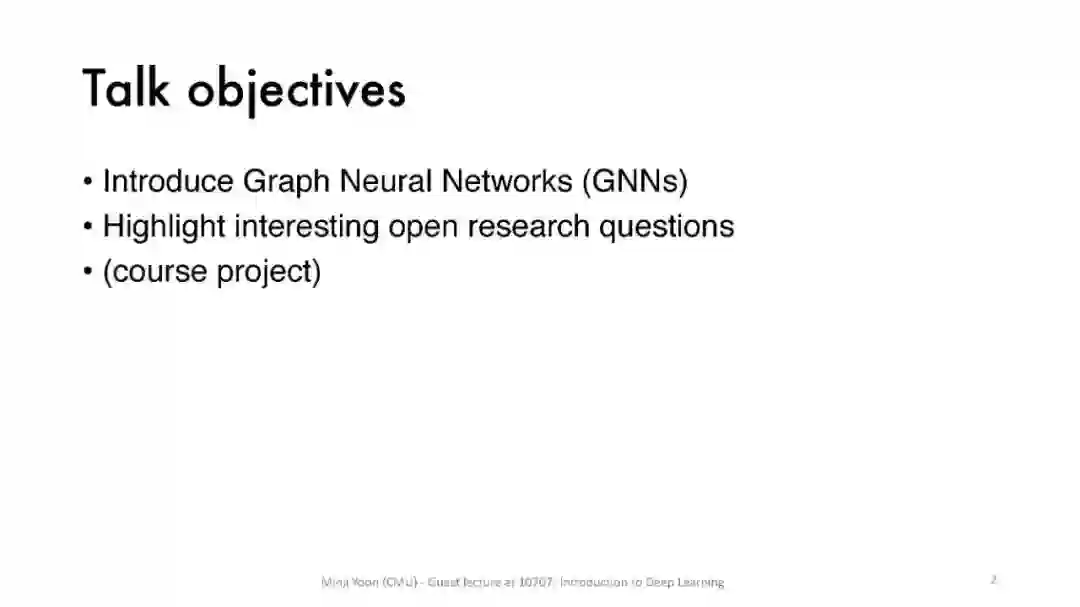 这是由Ruslan Salakhutdinov教授为卡内基梅隆大学深度学习班做的关于图神经网络的客座演讲。本文介绍了1)图神经网络的一般概念和2)该领域有趣的开放研究问题。它针对的是具有深度学习背景但没有(或很少)图神经网络知识的人。