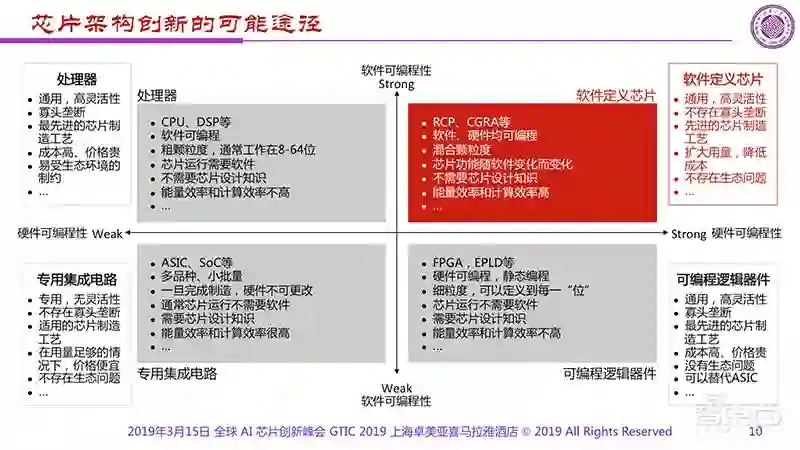 如果把已知的芯片都放到了二、三、四这三个象限后,一定很奇怪第一个象限中的是什么?第一个象限对应的芯片应该有很好的软件可编程性,同时有很好的硬件可编程性。如果这两者都成立的话,恰恰就是刚才所讲的“软件定义芯片”,不仅软件可编程,更重要的是硬件也可编程。