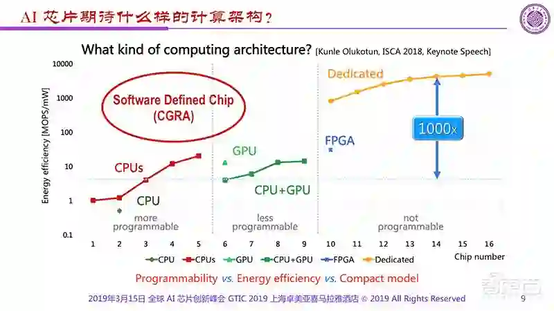 显然,可以有比较多编程的像CPU,有一定编程能力的是GPU,不需编程的就是专用芯片。可以看到这几者间有重要的差距就是能量效率的差距,如果我们仔细看一看的话可以看到从Dedicated到GPU蓝线之间有1000倍的差距,而1000倍是一个很重要的分界线,如果芯片做不到这一点,显然就达不到目的。