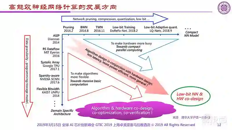 另外,我的同事做了一张高能效神经网络发展方向的图,纵轴是架构在不断创新往下走,而横轴所表现的是不同神经网络模型,中间是通过算法设计和硬件设计的结合去产生更小延迟、更高能效和更通用的产品。