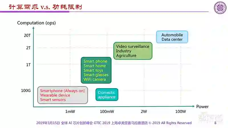 分析一下具体的引用场景,可以发现像:可穿戴设备、智能传感器等功耗限制为1mW;家电的等将近100mW;视频监控、工业和农业应用大概是W,但要2T的运算能力;而Automobile、DataCenter可以100W,但至少20T的运算能力。计算需求对应功耗的限制是我们一直面临的、非常难以解决的问题。