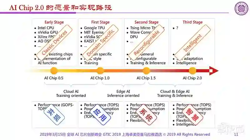 可以看出,上面每个阶段所关注的重点是不太一样的。早期更多是实现,只要做出来就好;而到了AI Chip 1.0,应用成为关键;AI Chip 1.5的时候关注的是系统;而AI Chip 2.0的时候关注的是智慧化。