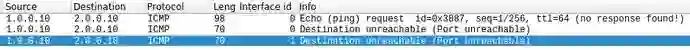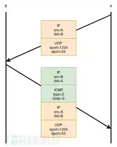 例如,UDP分组可能生成ICMP错误。这些错误通常封装在ICMP有效负载,IP报头加上违规数据包的下一个64字节内。图1显示了主机B拒绝封闭端口上的数据包的这种行为: