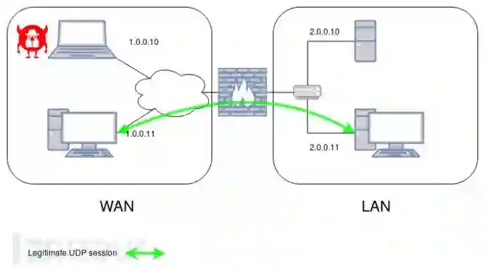 为了说明这个概念,让我们考虑以下示例。在一个简单的网络中,我们希望只允许LAN上的主机通过端口1234上的UDP与WAN上的任何主机联系。但我们仍然希望A接收带外错误。在这种情况下,将使用以下高级防火墙配置: