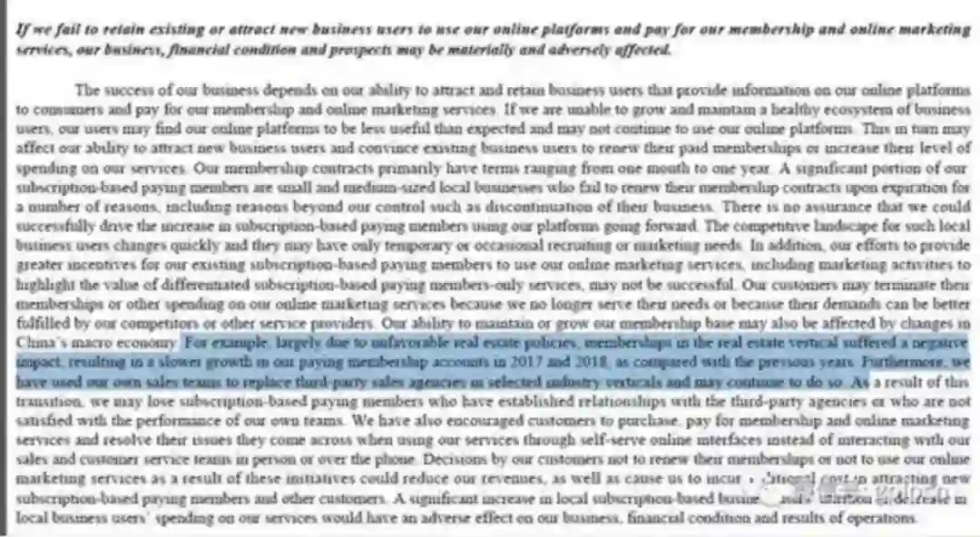 因此,在2018年年报中,对于地产经纪业务58透露了一个重要的信号:“主要因为相关的地产政策,地产经纪业务有负面影响。导致了付费会员账户增速降低。未来,我们会使用自己的销售队伍取代第三方代理机构”。