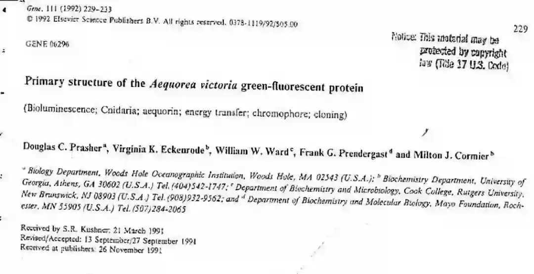 但在Prasher彻底告别GFP之前,他还是把克隆GFP基因的过程和结果写成一篇论文,于1992年发表。