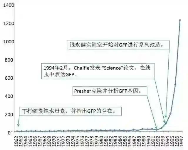 通过Google Scholar检索出的每年发表的提到GFP的论文数
