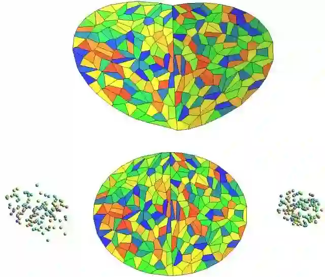 图8显示了几何方法生成的结果:每个胞腔映到一个具有同样颜色数据样本,上包络的面和它的投影胞腔具有同样的颜色。我们可以看到,首先最优传输映射将单位圆盘映射到所有的数据样本;其次,所有的power 胞腔都具有相同的面积,这意味着几何方法完美地生成了经验分布 。我们注意到,Brenier势能函数(上包络)有一个尖脊,将梯度分成了两个团簇,因此能够处理多个团簇的分布逼近问题。