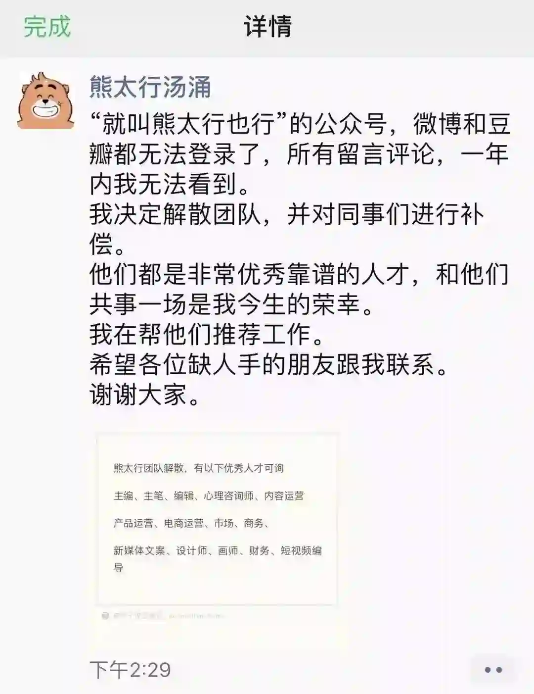 1. 「就叫熊太行也行」团队宣布解散,公众号已“无法找到”
