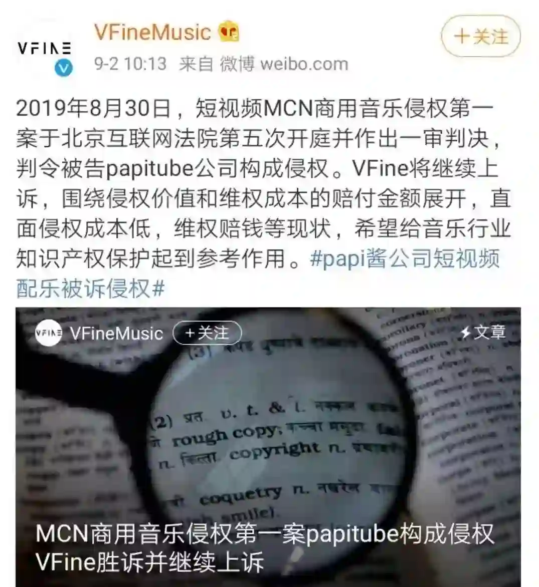 2. papitube音乐侵权案宣判,VFine Music不满赔偿金额将继续上诉