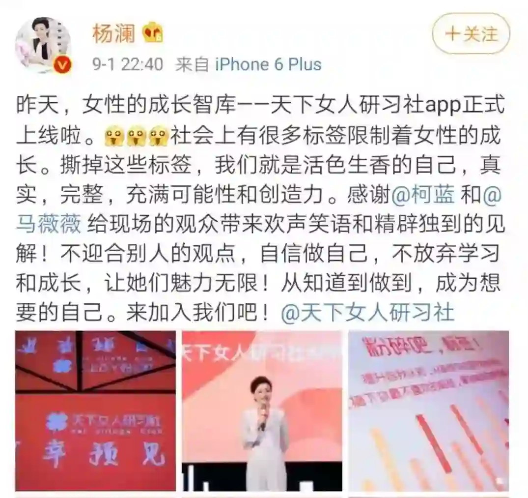 新榜讯 8月31日,著名主持人杨澜创立的知识付费App「天下女人研习社」正式发布。据了解,该产品是专注于女性领域的知识付费平台,目标对象为25-45岁的职场女性,通过“专项课+训练营+线下沙龙”新模式,构建学习、训练到成效实践的完整知识服务体系。