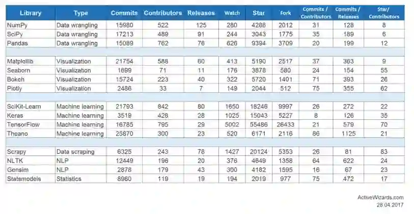 总结:以上这些就是由数据科学家和工程师们公认的值得你一探究竟的Python库。这是每个库在Github上动向的详细数据: