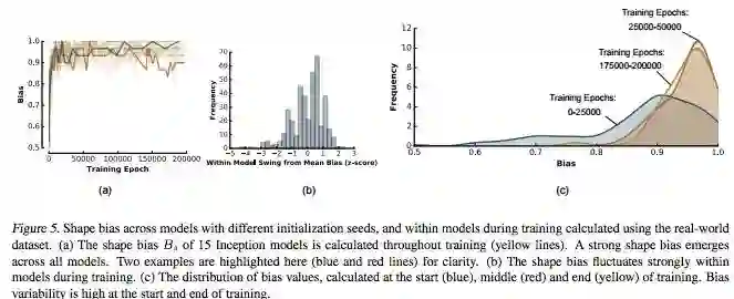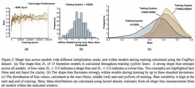 我们观察到,在我们网络的早期训练过程中,形状偏好逐渐出现。这让人联想到人类形状偏好的出现:心理学家已经观察到,幼儿的形状偏好比年龄较大的孩子小,成年人显示出最大的偏好。