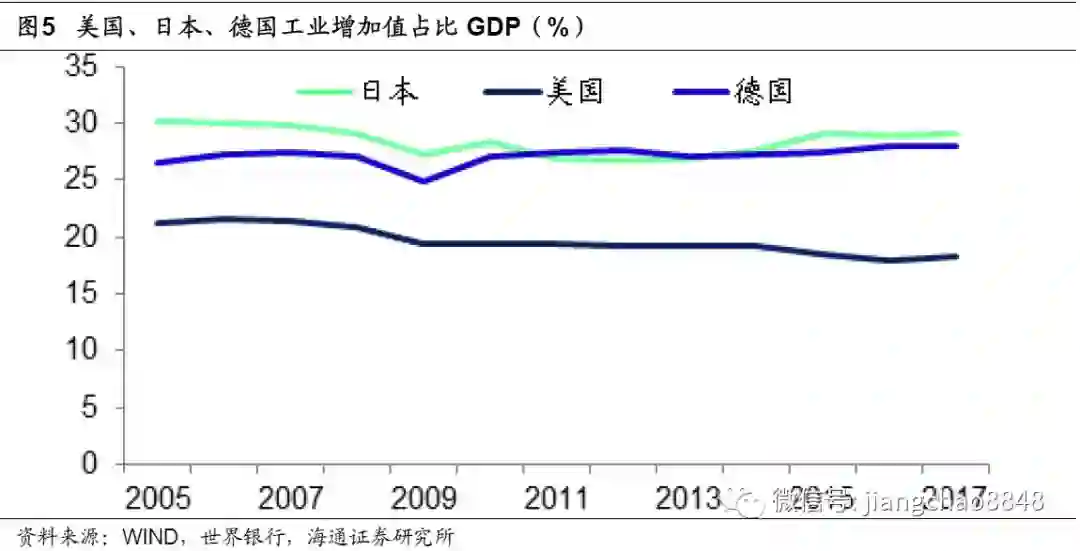 我们知道,德国和日本都是制造业大国,其工业增加值占GDP比重保持在30%左右,远高于美国的18%。