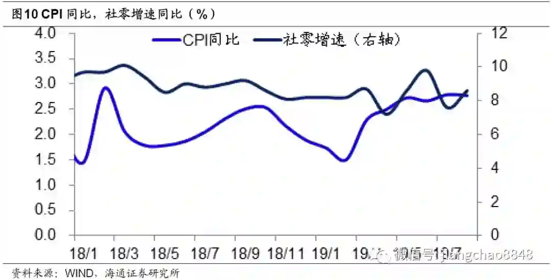 另一方面也有经济基本面的支撑。今年虽然经济增速稳中有降,但是经济中占比最大的消费增速保持稳中有升。今年年初时,社会消费品零售总额增速仅为8.2%,而在最近的2个月,社零增速平均为8.7%。