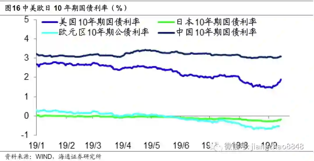 由于欧日央行的负利率政策不断加码,使得10年期日债和德债利率分别降至-0.16%和-0.45%,均处于历史最低点附近。