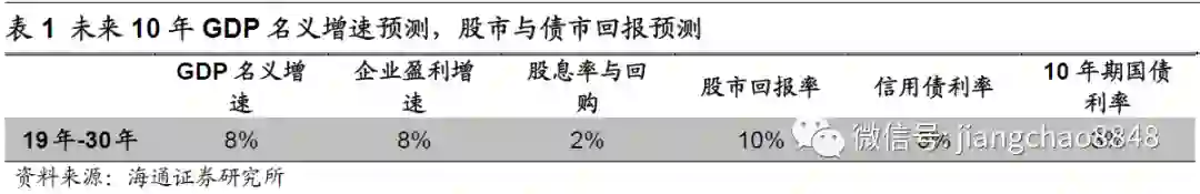 其中债市中的信用债或有望提供5%左右的票息回报,与之相应10年期国债利率或保持在3%左右。如果利率水平保持稳定,那么股市的估值水平将保持平稳,但是依靠7-8%的盈利增速和2%的股息率,A股提供的年均回报率有望达到10%左右。这其实是长期的股债慢牛行情。
