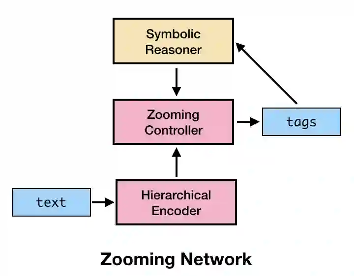 为了更好地利用上述文本特征,我们提出了变焦网络(Zooming Network)的概念。整体上看,变焦网络由三个主要部分组成:层次化编码模块、变焦控制器模块、符号推理模块,分别完成针对语言单元特点的编码过程、解码过程,以及针对自然语言符号化的推理辅助解码。我们将该网络设计应用到长文本序列标注任务上,取得了非常好的效果(f1 score 超过 bi-LSTM-crf 模型 10% 以上)。