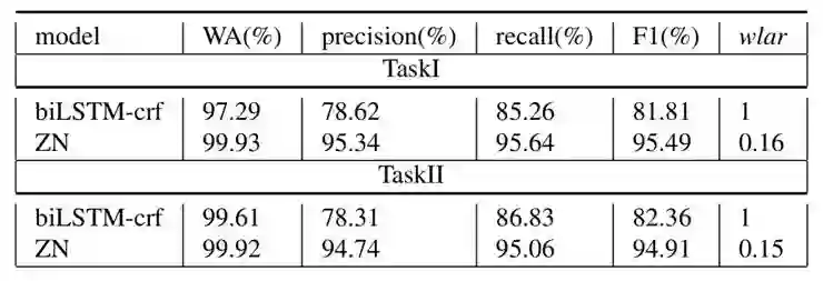 我们使用序列标注经典最优模型 bi-LSTM-crf 作为 baseline model 来比较模型的处理性能,实验结果如下(模型参数数量为同一量级):