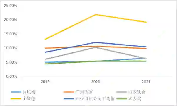 与同庆楼、广州酒家、西安饮食、全聚德四家同行业A股上市公司相比,2019-2021年之间老乡鸡的毛利率低于上述可比上市公司综合毛利率的平均值。