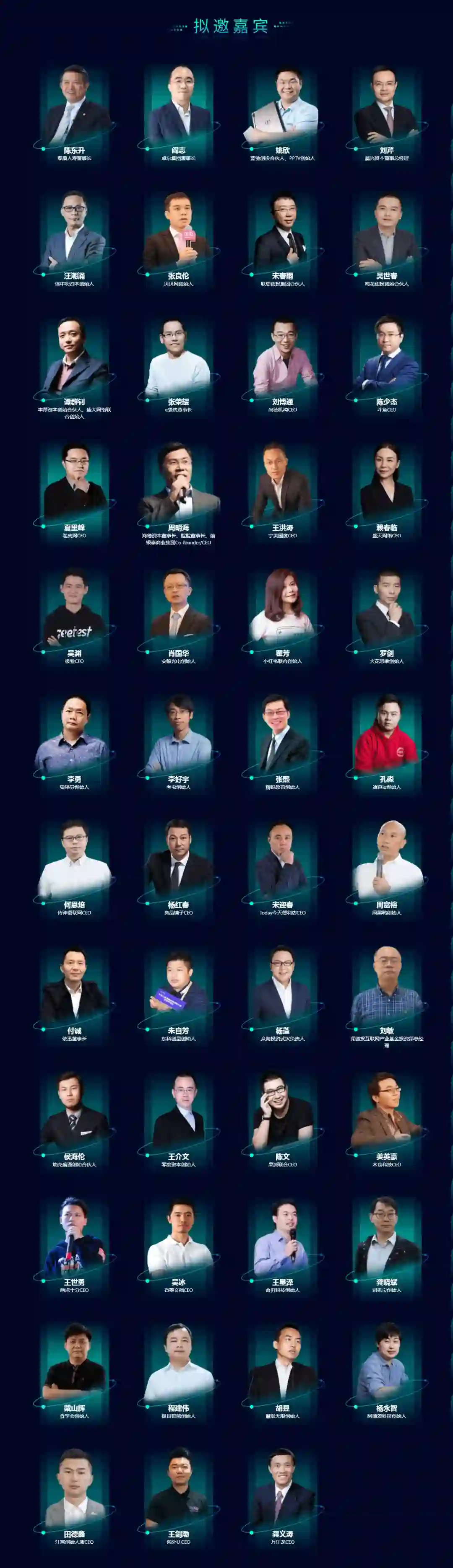 本次峰会将拟邀重磅嘉宾人人网创始人陈一舟、PPTV创始人姚欣、斗鱼TV CEO陈少杰、尚德机构CEO刘博通、泰康人寿董事长陈东升、卓尔集团董事长阎志、晨兴资本董事总经理刘芹、信中利资本创始人汪潮涌等大咖分享他们对互联网创新与突破的见解,共同探讨城市创业的新模式与新趋势。