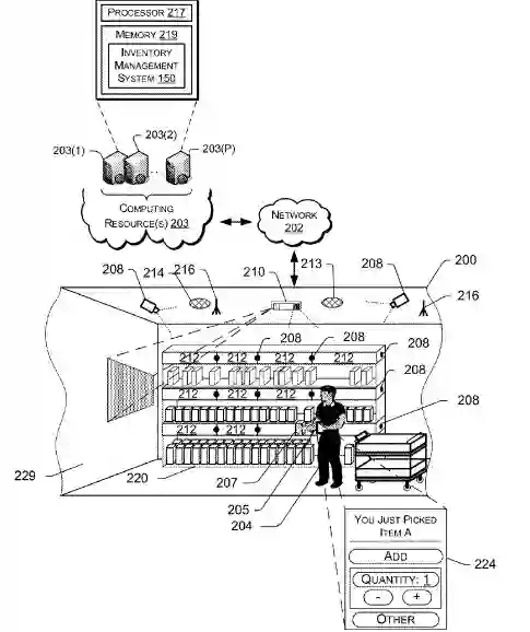 专利文件里描述到,天花板上的208用来采集用户和货品的位置、货架两侧的208用来捕捉用户的图像和周围的环境,货架内的208用来确定货品的位置或用户手的移动(进入和离开货架)。