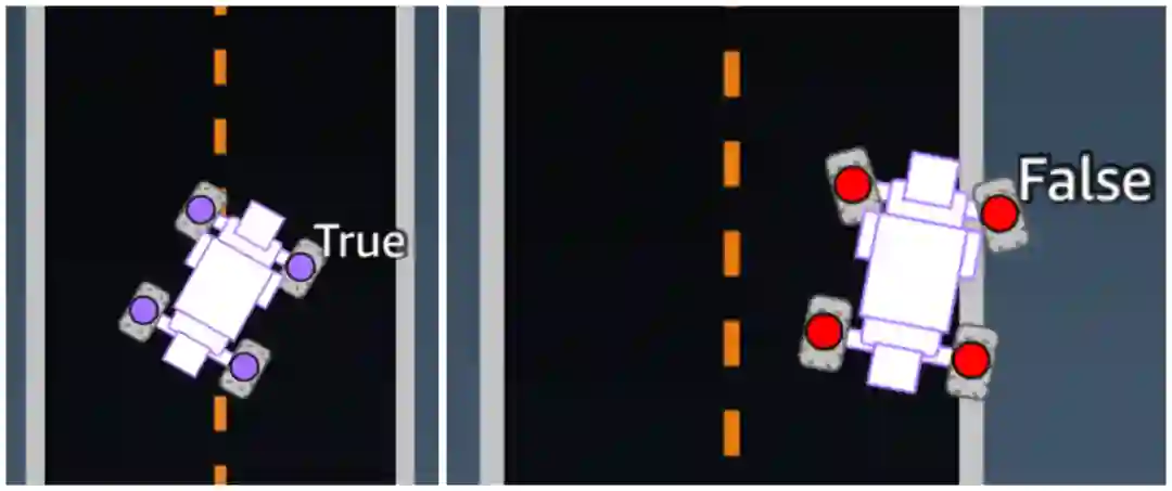 具体到代码上,如果有车轮不在赛道上发生一次,就扣除奖励函数,反之,就一直以小车走过的进度来奖励它。