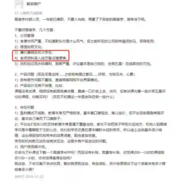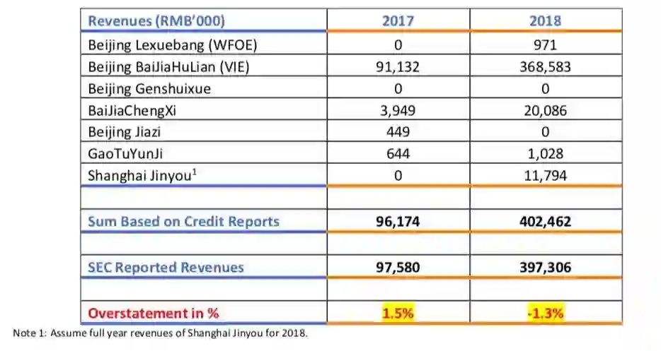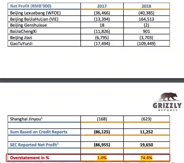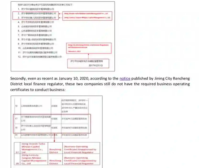 类似这样的内容,Grizzly Research 列举了很多,都暴露跟谁学老师质量并没有宣传中那么好。八、前CFO上市前夕突然离职,继任CFO名声存疑。宋欲晓是原跟谁学财务总监,但是在上市前的几个月就离职了。继任者沈楠于2018年12月入职,其于2017年11月到2018年12月期间担任北京新诺阳光国际文化传播有限公司(经营外教中国)CFO。Grizzly Research 发现外教中国是个骗局,存在不遵守承诺,剥削外国人,故意提供错误签证和从薪水中收取两倍税款,强迫加班等等严重问题。换言之,Grizzly Research 认为沈楠的前东家涉及指控很多,诚信和名誉方面问题较大。九、陈向东于2017年参与设立的2家金融公司,济宁世纪唐人民间资本管理有限公司(持有35%)和济宁慎德泰和民间资本管理有限公司(持有50%)。一直没有在当地拿到营业执照。