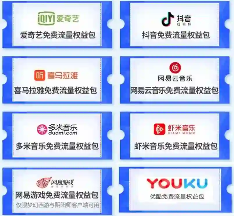 4月,上海电信手机用户可以在优酷、抖音、爱奇艺、喜马拉雅、网易云音乐、多米音乐、虾米音乐、网易游戏这8款热门App中,挑选自己中意的一款,领取“免费流量权益包”,领取了这款“包包”后,本月使用这款App所产生的流量免收流量费。